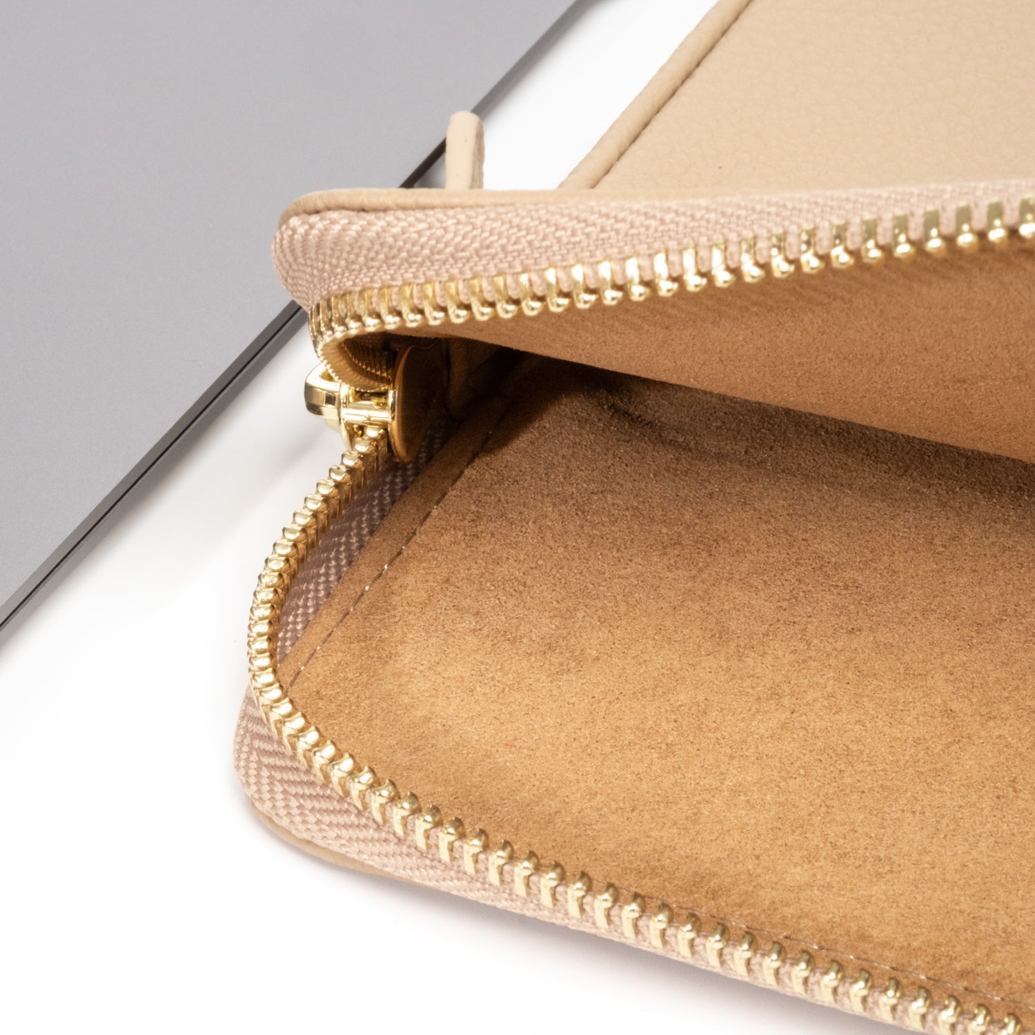 - Secure luxurious light gold hardware and padded leather zipper pull